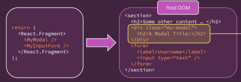 JSX 한계사항 때문에 이러한 불필요한 div들이 실제 DOM으로 렌더링 되는데 시멘틱 웹적으로도 좋지 않고 웹 페이지 스타일링에도 문제를 발생시킬수 있으며 앱이 커졌을 경우 뚜렷한 성능저하로 연결되게 된다 .